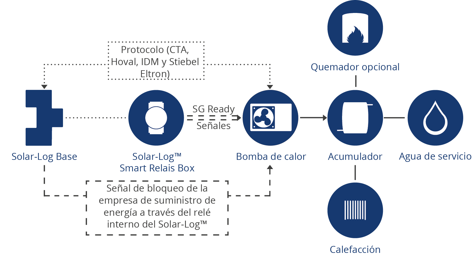 La combinación de la energía fotovoltaica y la bomba de calor ofrece un mayor potencial para optimizar su propio consumo de electricidad. La idea básica es que una bomba de calor se alimenta de la electricidad fotovoltaica sobrante. Dependiendo de cómo esté conectada la bomba de calor al Solar-LogTM, se comunica a la bomba de calor una señal de habilitación o un exceso de potencia. Gracias a la integración de diferentes protocolos, el Solar-LogTM es compatible con varios fabricantes de bombas de calor.