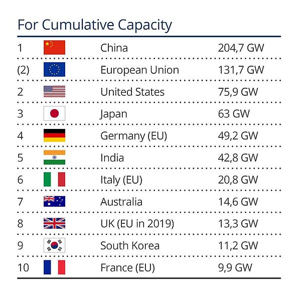 La tendenza al rialzo e al ribasso del settore è chiaramente visibile anche nella capacità installata all'anno. Nonostante le numerose avversità e le gravi perdite, ad esempio nella produzione di moduli, la Germania si colloca al quarto posto in un confronto globale. Con 49,2 gigawatt a gennaio 2019, la Germania detiene circa il 40% di tutti gli impianti fotovoltaici dell'UE.
